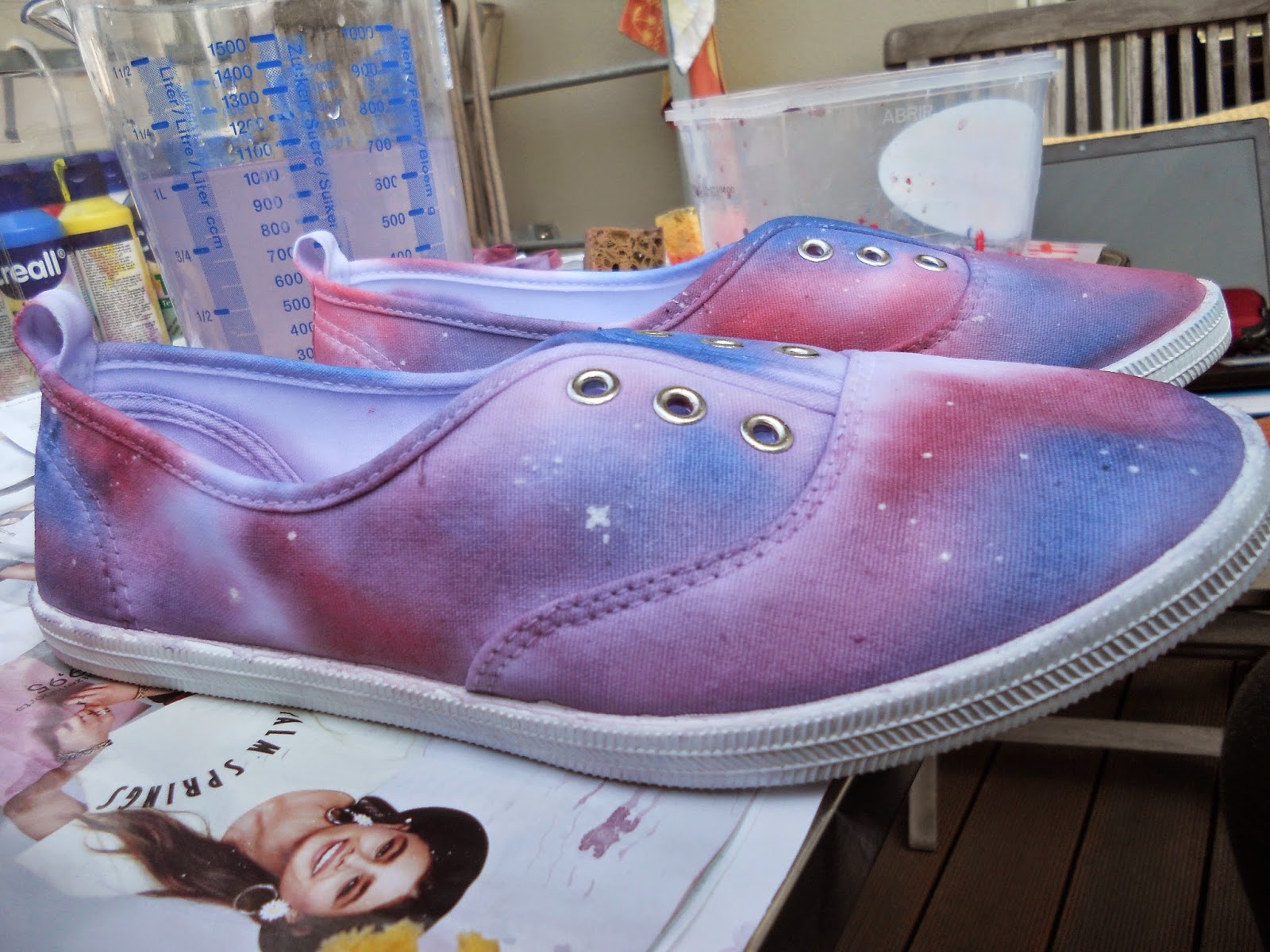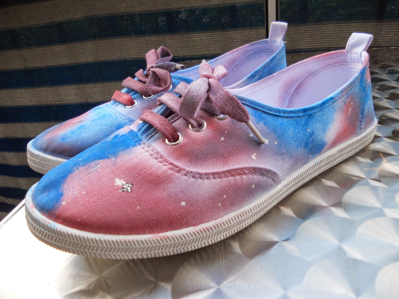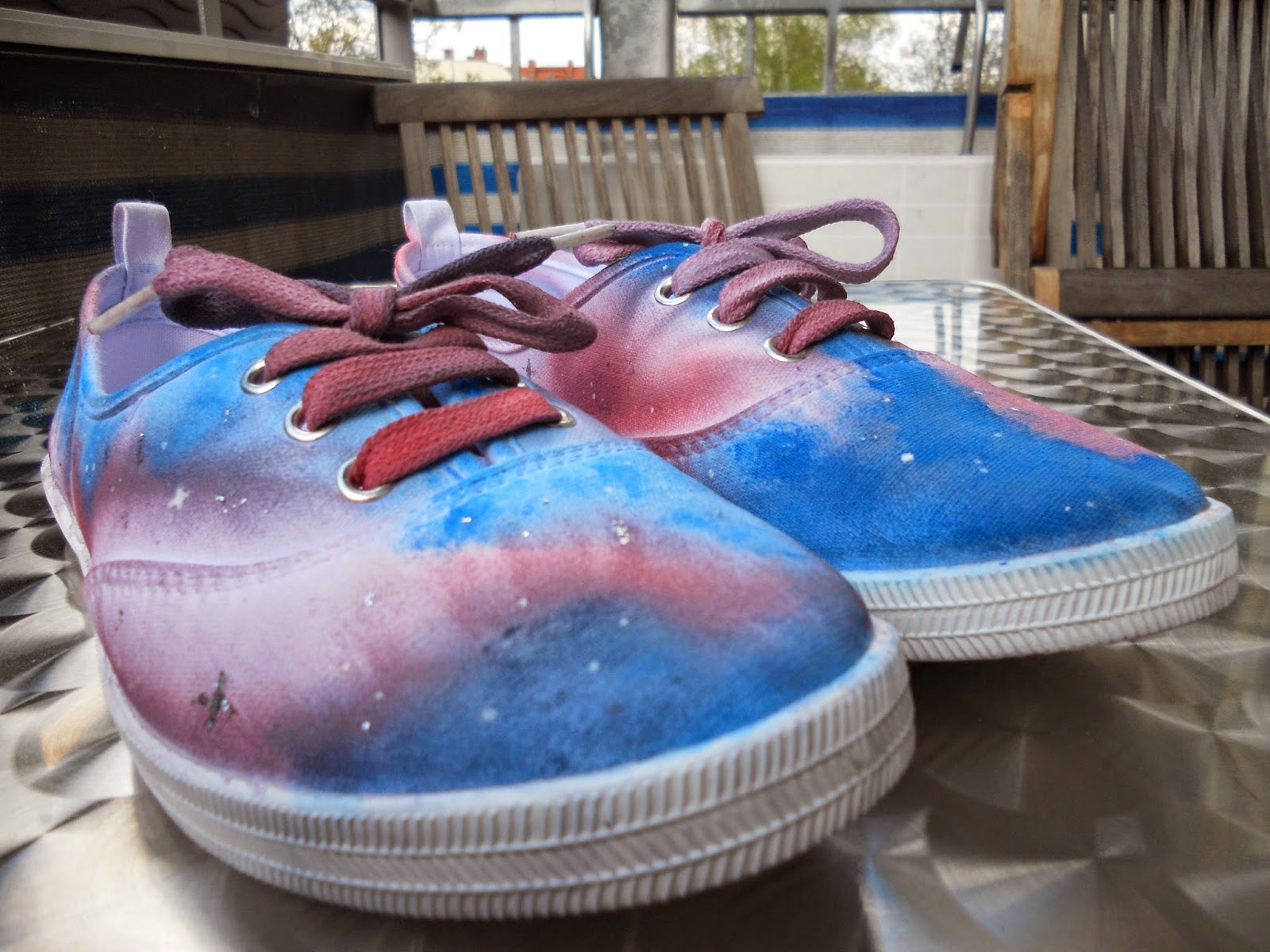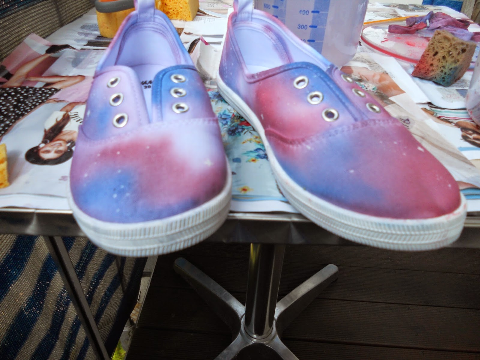 Wenn ihr eure Schuhe überall mit verschiedenen Blau, lila und rosa Tönen betupft habt und zufrieden mit eurer Arbeit seid, könnt ihr noch ein bisschen weiße Farbe auf einen trockenen Pinsel geben, eure Schuhe besprenkeln und so Sterne kreieren. Ich habe außerdem noch ein paar einzelne Sterne dazu gemalt.